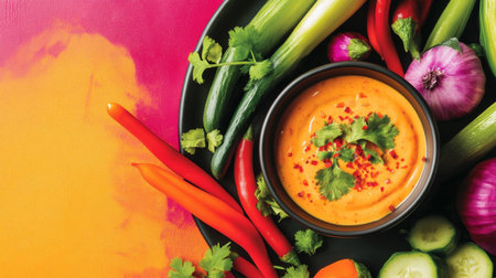 A vibrant array of colorful dipping sauces paired with fresh salad ingredients, perfect for enhancing meals, picnics, and gatherings. Ideal for food photography.