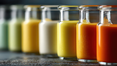 A stunning array of colorful glass bottles filled with fresh juices and smoothies, perfect for health enthusiasts and culinary art lovers. Ideal for vibrant kitchen displays.