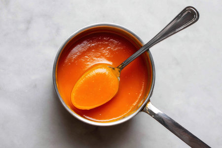Freshly made carrot soup is simmering in a stainless steel pot, a spoon lifting a creamy portion, ready to be served
