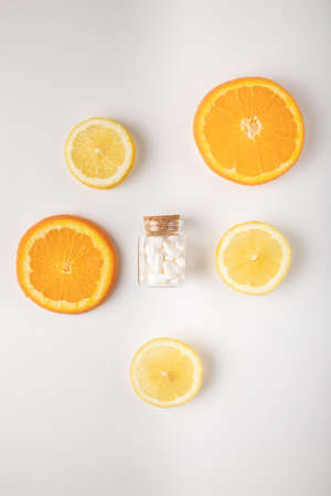 Vitamin C. Orange slices on a bright background and vitamin C tablets. The layout of the branding of a pharmaceutical product.Flat lay. Copy space