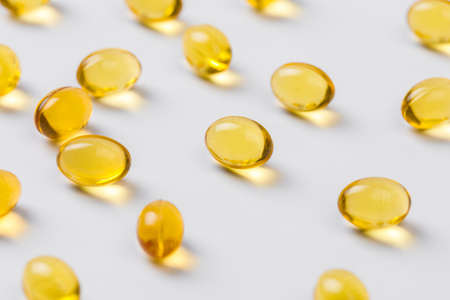 yellow transparent capsules omega 3 lie on a white background. healthy food concept