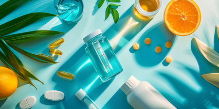 Various dietary supplements and fresh citrus fruits are artistically arranged, showing a focus on health and nutrition.