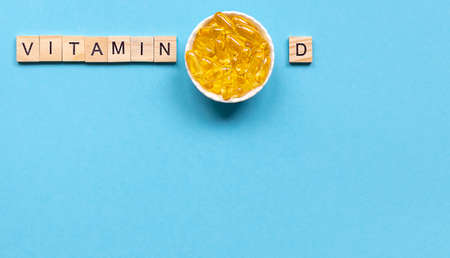 Yellow capsules in the round bowl and the word vitamin D from wooden cubes on a blue background. Healthy concept with copy space.