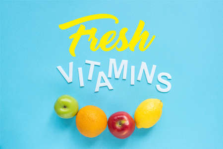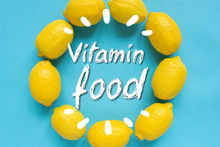 top view of ripe yellow lemons arranged in round frame with vitamin food illustration on blue background
