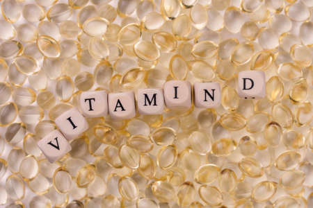 Vitamin D supplement capsules - science based nutrition. close up with vitamin D oil capsules with copy space on a yellow background