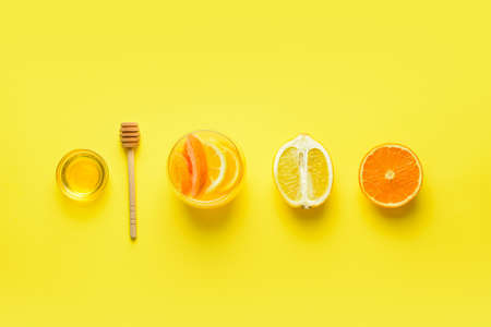 Vitamin C. Cosmetic products and fresh citrus fruits.