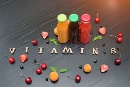 Three bottles of juice, the inscription Vitamins and fruits. Wooden background.