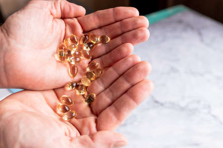 Fish oil capsules in hand. Biologically active prey. Vitamins and dietary supplements.