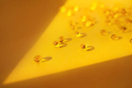 Close-up of golden colored oil supplements, capsule, health concept, pharmaceutical tablets