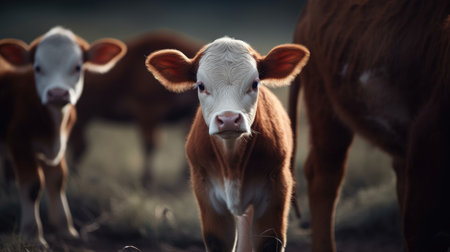 A close-up captures a young calf with soft, brown fur alongside its mother. The image showcases detailed textures and a warm, natural color palette. The composition emphasizes intimacy, likely taken in a farm or rural setting. Suitable for various projects, including editorial features and commercial advertising.