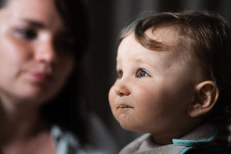 Cute baby with light hair, wearing a striped jacket, looking at the camera with a gentle smile, held by a woman kissing his head.