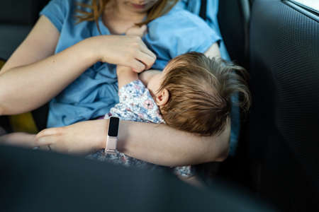 Close up breastfeeding small caucasian baby with her unknown mother sucking milk on the back seat of the car while traveling