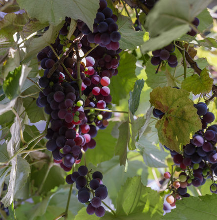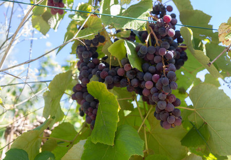 Close-up of ripe red grapes growing on vine in sunny vineyard, ready for harvest