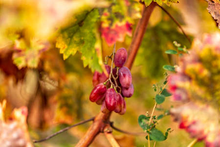 Bright autumn red orange yellow grapevine leaves at vineyard in warm sunset sunlight. Beautiful clusters of ripening grapes. Winemaking and organic fruit gardening. Close up. Selective focus.