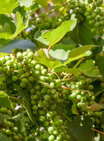 Clopse up of ripening grape fruit on vine branches in summer garden.