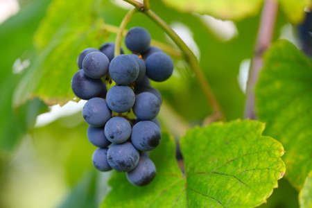 Ripe grape fruits grow in the garden. Fresh blue berries hanging on a branch. Organic vegetable growing