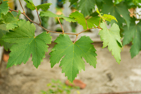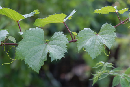 A close-up of the green leaves on an unlaunched grape vine, with a blurred background of nature and garden in summer.
