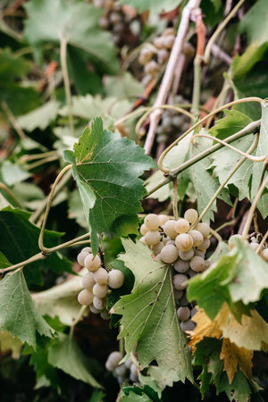 A bunch of ripe white grapes hangs on a green vine. Fresh autumn yellow grapes, harvest. Georgian vineyards and wineries. Vertical photo with growing grapes.