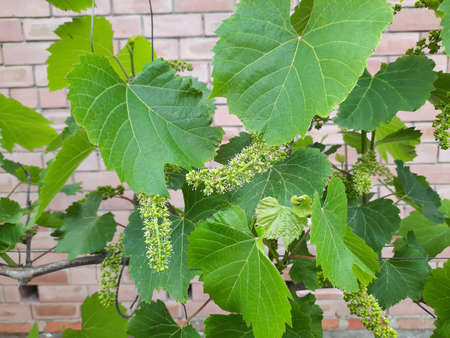 Grape vine with young leaves and buds blooming on a grape vine in the vineyard. Young unripe grapes in the spring.