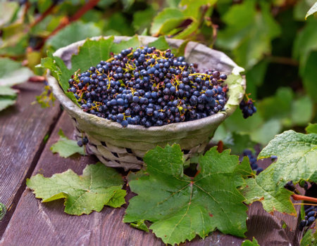 Freshly harvested firefly grapes fill a rustic basket, resting on a wooden surface surrounded by vibrant green leaves. This captures the essence of a fruitful vineyard in late summer.