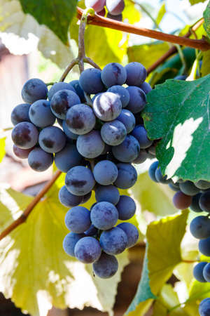 Close-up of ripe blue wine grapes on vine, vineyards in autumn harvest. Fruits in fall. beautiful red grapes ready for harvesting