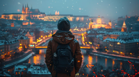 Silhouette of the pensive young man waiting for sunrise on the hill against urban skyline. Prague, Czech Republic.