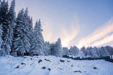 Snowy landscape at sunset, frozen trees in winter in Bulgaria.