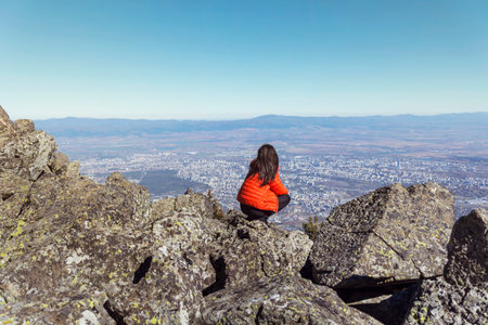 Young woman in red jacket sitting on top of a mountain and looking at the city