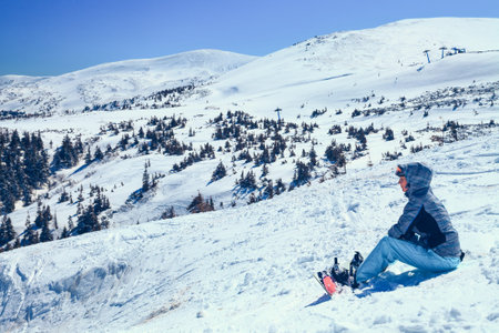 Man waving on white slope near icy bent tree. Slope trail and distant snowy mountain range in the Carpathians in Ukraine