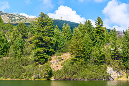 Karkamski Lake, Bulgaria, pine trees forest and todorka ski lift, summer landscape