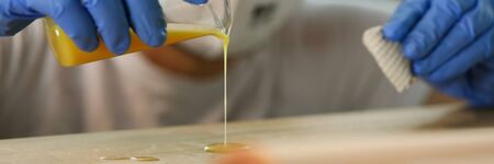 Close-up of male hands in gloves pouring out wood varnish on wooden surface. Carpenter varnishing furniture. Carpentry work and joinery processing concept