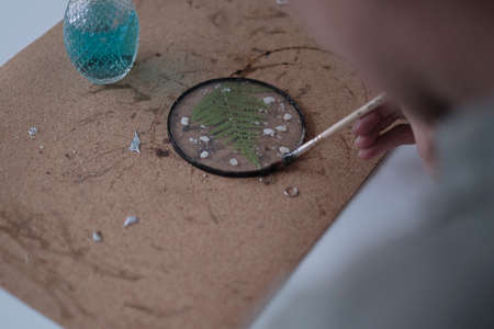 woman fixes glass plates. A picture of dried flowers. Master class on creating frame. be more creatively engaged. A Life of Happiness and Fulfillment