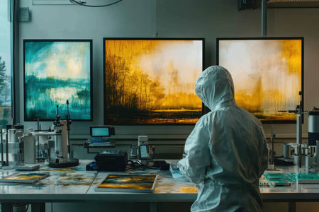 A person in a protective suit creates abstract artwork surrounded by vibrant digital displays in a bright studio.