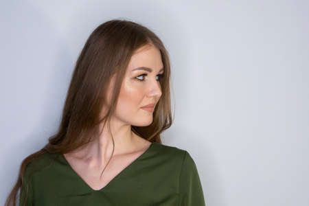 Beautiful Girl Long Hair. Tourist jacket, white wooden wall.
