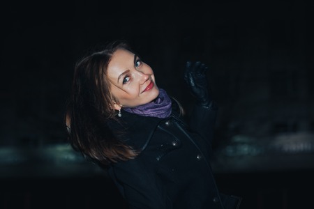 Portrait of a smiling young woman with short hair in hat, eyeglasses, black coat standing on a city street looking at camera. Enjoying weather and having fun. Candid people