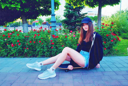 Young beautiful lady sitting on skateboard near the red flowers on decorative bush.