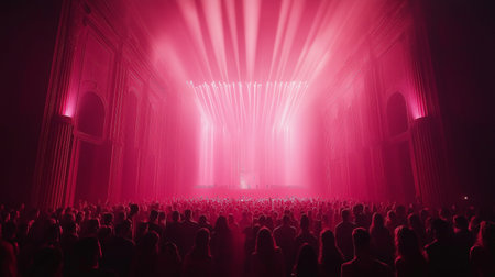 Crowd watching a concert in a theater with red light rays.