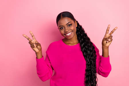 Photo of lovely young tail hairdo lady show v-sign wear sweater isolated on pink color background