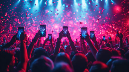 Crowd cheering at a live music concert with hands raised up with smartphones.