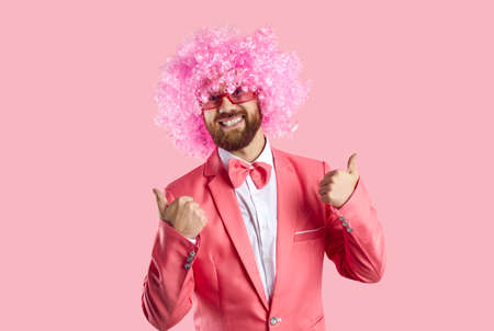 Portrait of overjoyed young man in suit and funny wig isolated on pink studio background show thumbs up. Smiling male feel joyful recommend sale deal or offer. Recommendation, entrainment.