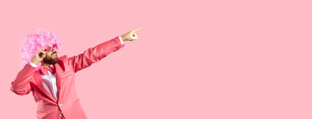 Portrait of cheerful guy points at blank text copy space background on the right. Funny clown wearing funky pink suit, curly carnival wig and sunglasses invites you to cool party or great holiday sale