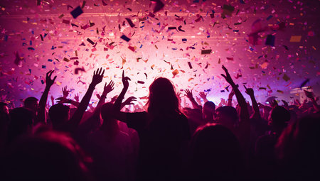 People are gathered at a large indoor space, raising their hands in the air. Colorful confetti is falling from above as music plays. The atmosphere is lively and energetic.