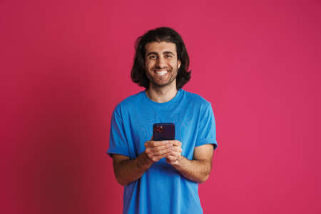 Unshaven brunette man in t-shirt using mobile phone and smiling isolated over pink background
