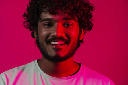 Portrait of a guy with colorful neon light on pink studio background. Male model with calm and serious mood. Facial expression, cyberpunk, millenials lifestyle and look like. Future, technologies.