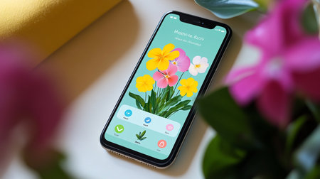 Smartphone screen displaying an app on a table with a flower bouquet