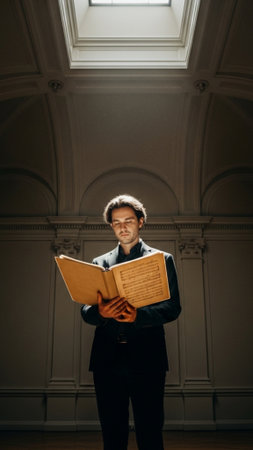 A full-body vertical composition capturing a classically dressed musician holding ancient sheet musi