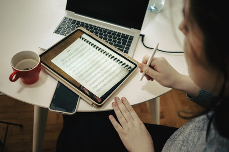Composer analyzing complex classical music scores generated by artificial intelligence on a digital tablet in a quiet elegant workspace.