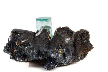 Macro mineral stone Aquamarine and black tourmaline, Schorl on a white background close up
