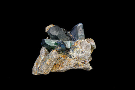 macro photography of sample of natural mineral from geological collection - unpolished Azurite mineral crystals from Jezkazgan, Kazakhstan on black granite background