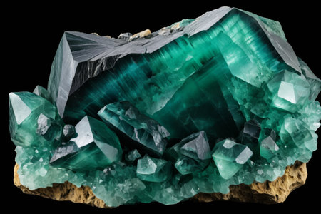 emerald pyramid-shaped gemstones, with rough edges and unpolished authenticity, are showcased on a sleek black background. the vibrant hues of azure, aquamarine, dark magenta, and hints of hinchel or create a captivating contrast. this stunning composition, captured by photographers ray collins and mao hamaguchi, exudes a unique and mesmerizing beauty. ai generated